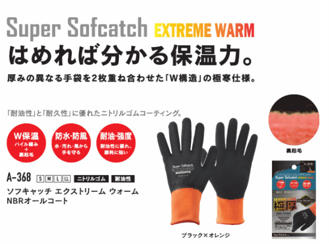 おたふく手袋 ソフトキャッチ エクストリーム ウオーム NBRオールコート A-368 はめれば分かる保温力、雪かき・寒冷地での作業・DIYなどに。